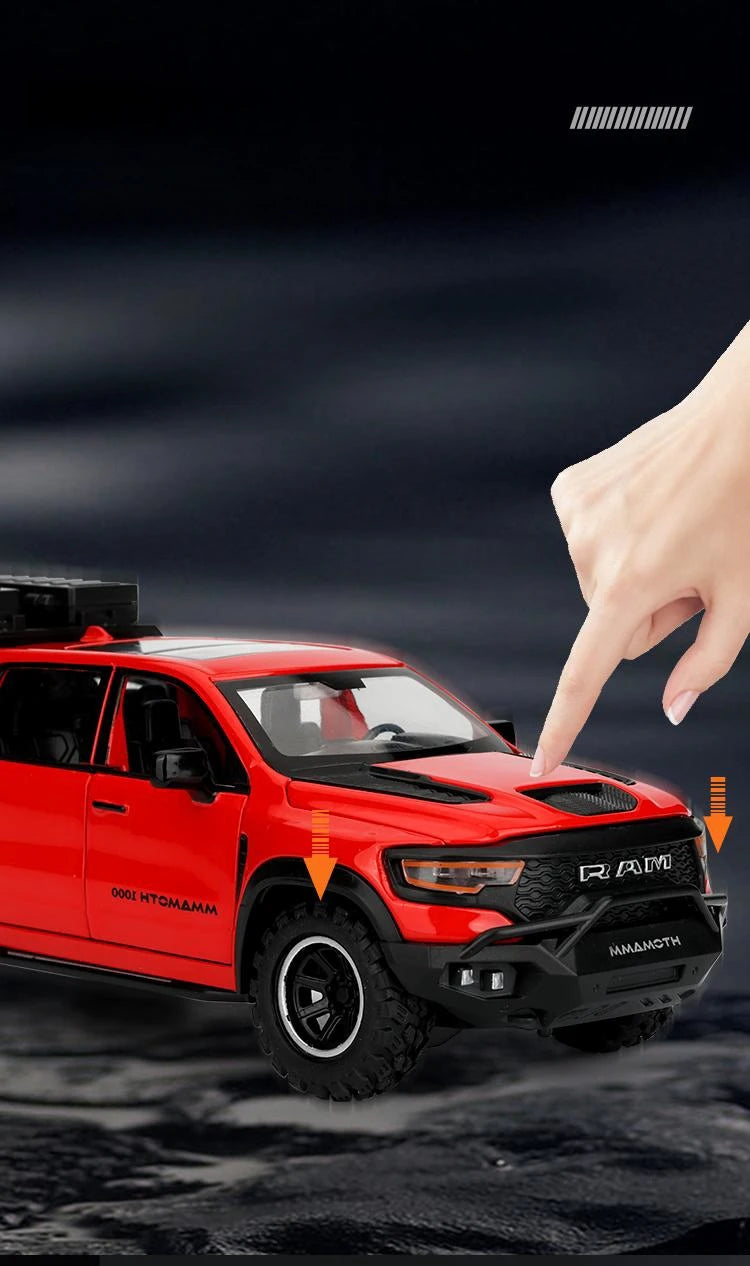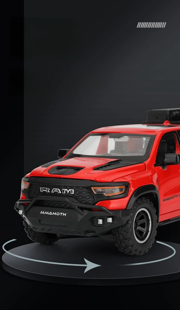 1/32 Dodge RAM MAMMOTH Pickup Toy Car Miniature Diecast Metal Off Road Vehicle Model Pull Back Sound Light Collection Gift Boy